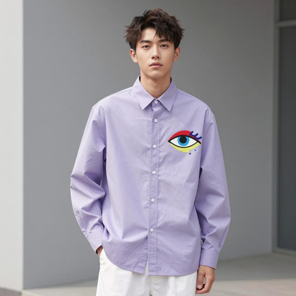 Rain gear man costume, photorealistic portrait, young Asian man, wearing black shiny raincoat, hands in pockets, standing on sunlit sidewalk, blurred background, green trees, red and white traffic sign, car in background, slightly overcast, casual urban setting, soft shadows, medium shot, realistic lighting, neutral expression, slightly wet pavement, summer afternoon, natural light