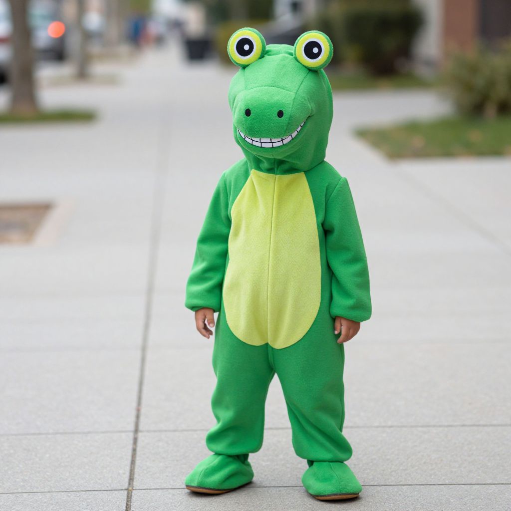 Kid Green Iguana Costume, a close up of a child in a green costume standing on a sidewalk