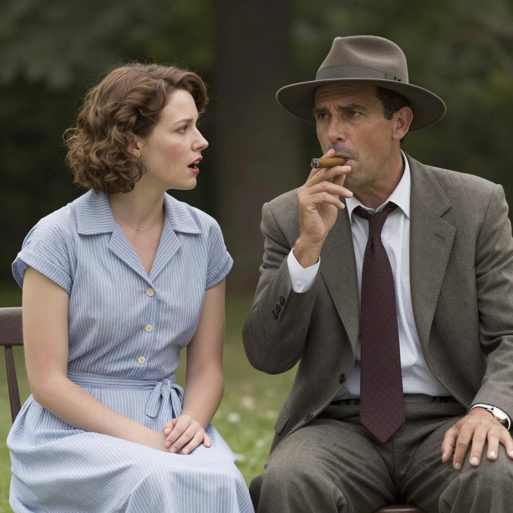 A man and woman outdoors. Man in a suit, tie, and hat, eating a cigar with his right hand. Woman in a striped dress, looking at him with an open mouth. Trees in the background. Man's left hand rests on a chair. Woman's short, wavy hair. Man's intense gaze, woman's surprised expression. Both seated.