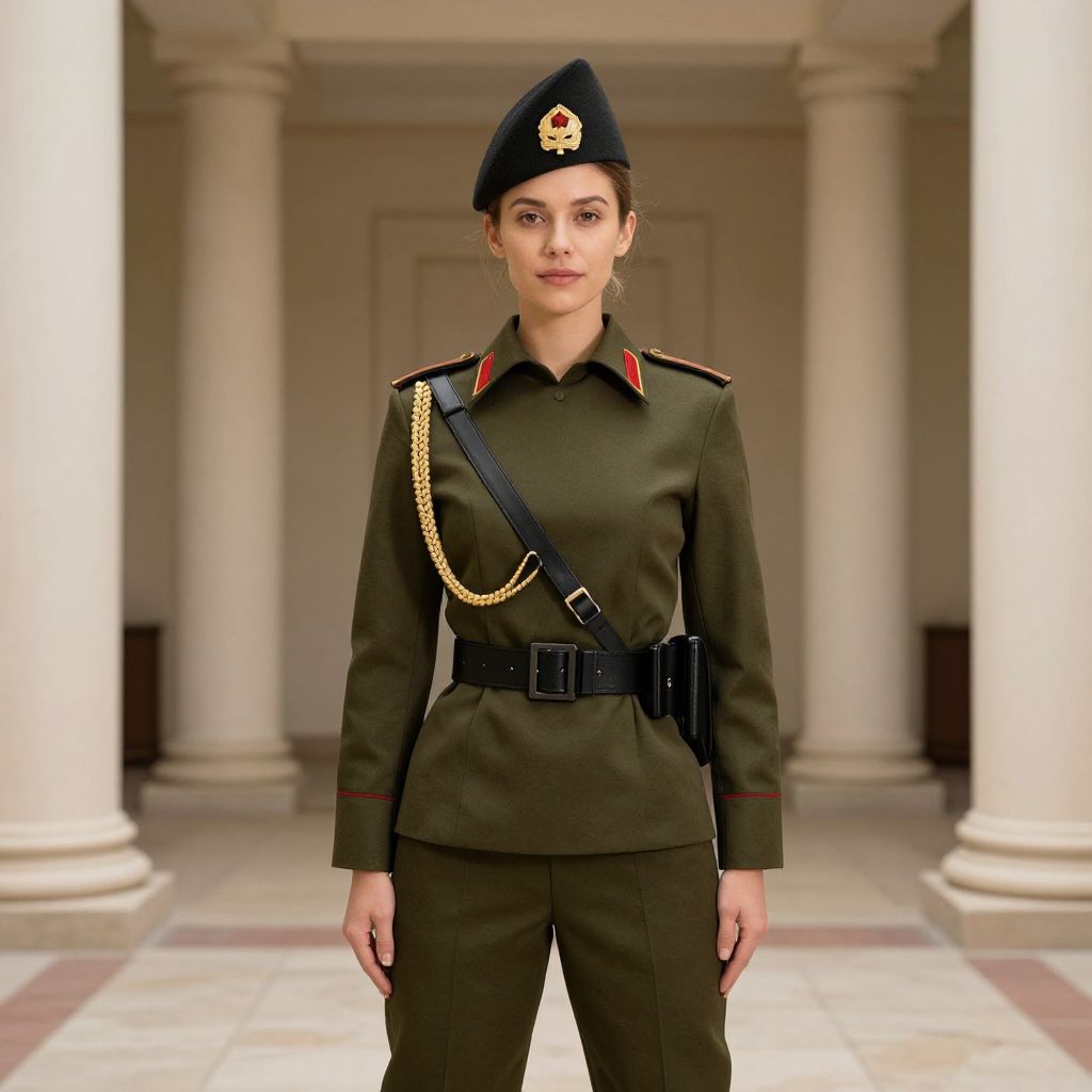 A photograph of a young woman standing in a grand, classical-style hall with tall white columns in the background. She is dressed in a dark green military uniform with red accents on the collar and epaulettes. She wears a black beret with a gold emblem, and a black strap with a gold chain crosses her chest. Her brown hair is neatly tied back, and she has a serious expression. The floor is tiled in a checkerboard pattern of beige and light brown. The lighting is bright, highlighting the uniform's details and her composed stance.