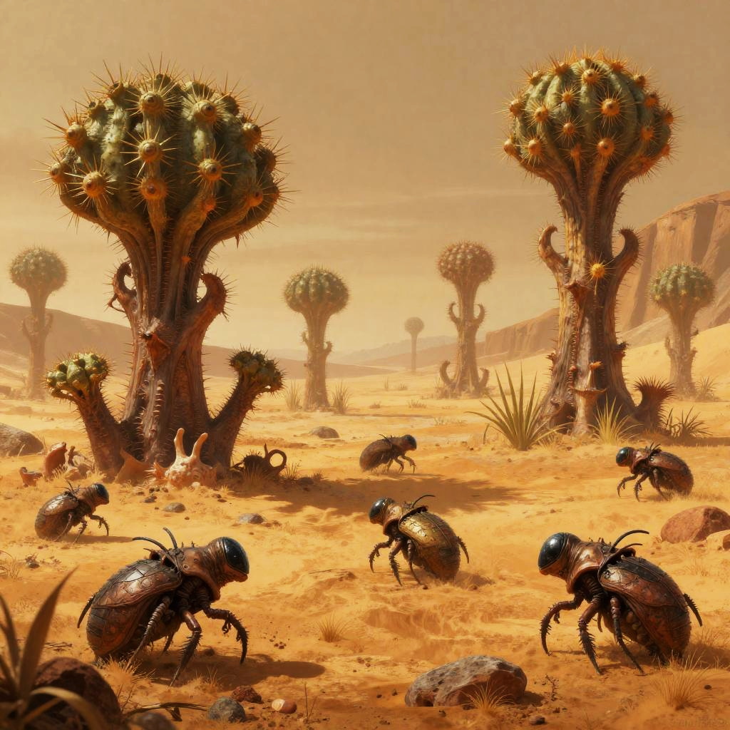 Alien fauna concept art portraying a desert-like alien landscape dotted with hardy, spiny plants and hardy insectoid creatures adapted to harsh conditions, bathed in warm amber light with detailed textures and speculative biological features blending fantasy and science fiction.