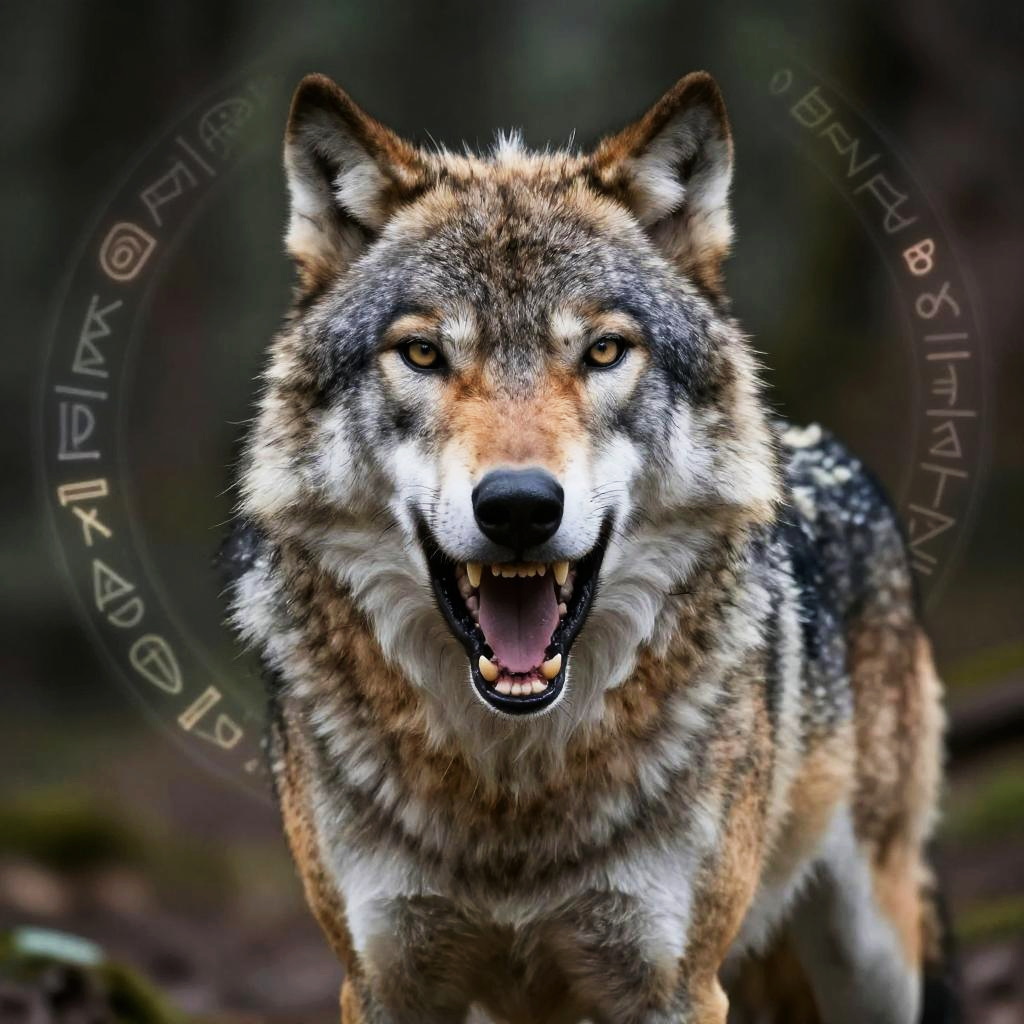 Epic portrait of an angry alpha wolf with a commanding presence, deep growl escaping from open jaws, intricate fur detail with a mix of grays and whites, ancient forest backdrop with mystical glowing runes subtly embedded, intense atmosphere.