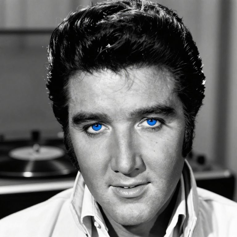 Natural Elvis Presley blue eyes portrait, black and white style with tinted blue eyes for emphasis, classic 50s hairstyle, subtle smile, intricate detail in hair and eyes, soft shadowing, vintage record player background, cinematic depth