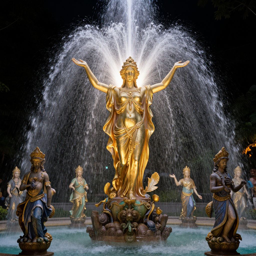 The image presents a surreal and highly detailed composition, featuring a fountain of life that exudes a sense of ethereal beauty. At the center, a golden statue of a woman, adorned with intricate details, stands gracefully, her arms outstretched as if embracing the divine light that pours forth from the fountain. The fountain itself is a magnificent structure, with water cascading down in a mesmerizing pattern, creating a sense of movement and vitality. Surrounding the fountain are several smaller statues, each meticulously crafted with a blend of gold and other metallic hues, adding to the opulence of the scene. The background is shrouded in darkness, allowing the vibrant colors and intricate details of the fountain and statues to stand out prominently. The interplay of light and shadow, combined with the rich colors and hyper-detailed textures, creates a visually striking and otherworldly atmosphere. The overall composition is balanced and harmonious, with the fountain and statues serving as the focal points, drawing the viewer's eye into the heart of the image.
