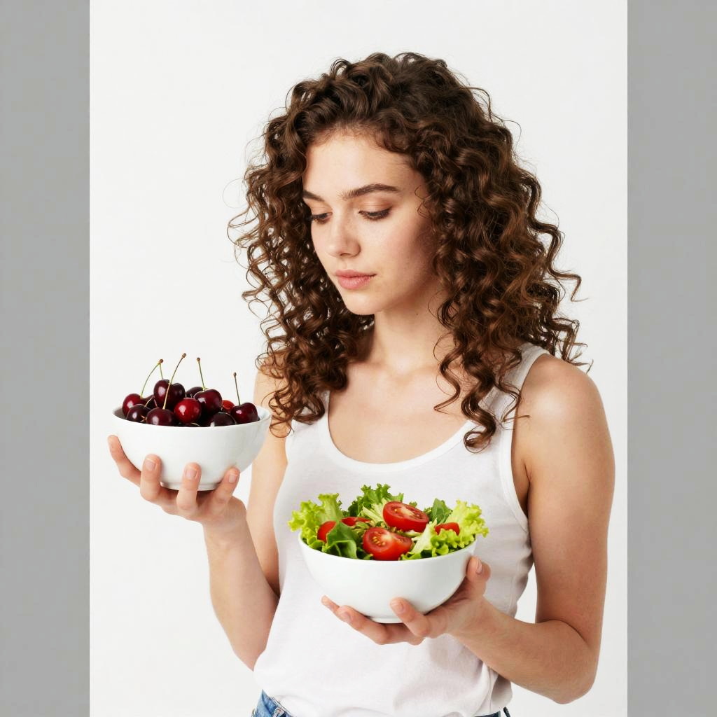 Photograph of a young woman with curly brown hair, wearing a white sleeveless top, holding two white bowls. She's looking down at the bowl in her left hand, which has red cherries, while the right hand bowl contains a fresh green salad with red tomatoes. The background is pure white, making her and the colorful food stand out. She has a focused expression, and the image has a grey border on both sides.