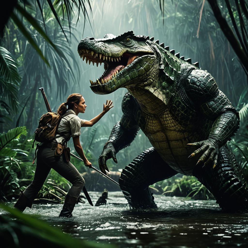Very dark focused flash photo, amazing quality, masterpiece, best quality, hyper detailed, ultra detailed, UHD, perfect anatomy, portrait, dof, hyper-realism, majestic, awesome, inspiring. Capture the thrilling showdown between the beautiful female Swamp ranger and the colossal jungle boss Titanic crocodile in an epic battle amidst the jungle. Embrace the action and chaos as these formidable forces clash. Cinematic composition, soft shadows, national geographic style, extremely detailed, dark, chiaroscuro, low-key, Bosstyle.
