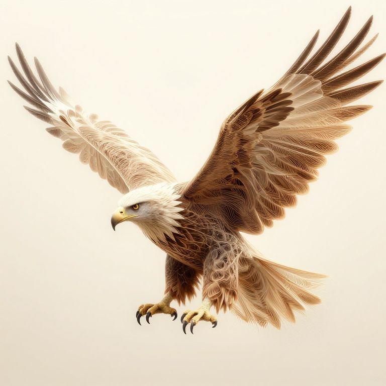 Digital illustration of a majestic bald eagle in mid-flight. The eagle's wings are fully extended, showcasing detailed brown and white feathers with intricate textures. Its sharp, yellow beak is open slightly, and its piercing blue eyes focus forward. The eagle's talons are outstretched, ready to grasp. The background is a bright, gradient white, emphasizing the eagle's powerful presence. The overall style is realistic with a slight artistic flair, highlighting the bird's grace and strength.