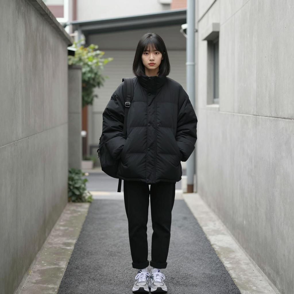 Fictional character costume, photorealistic, young Asian woman, medium skin tone, long black hair, loose pigtails, serious expression, wearing green and white oversized jacket, brown scarf, black gloves, olive green pants, neutral gray background, studio lighting, standing, centered, casual outfit, modern fashion, realistic ures, minimal shadows, slight soft focus, realistic proportions, detailed facial features