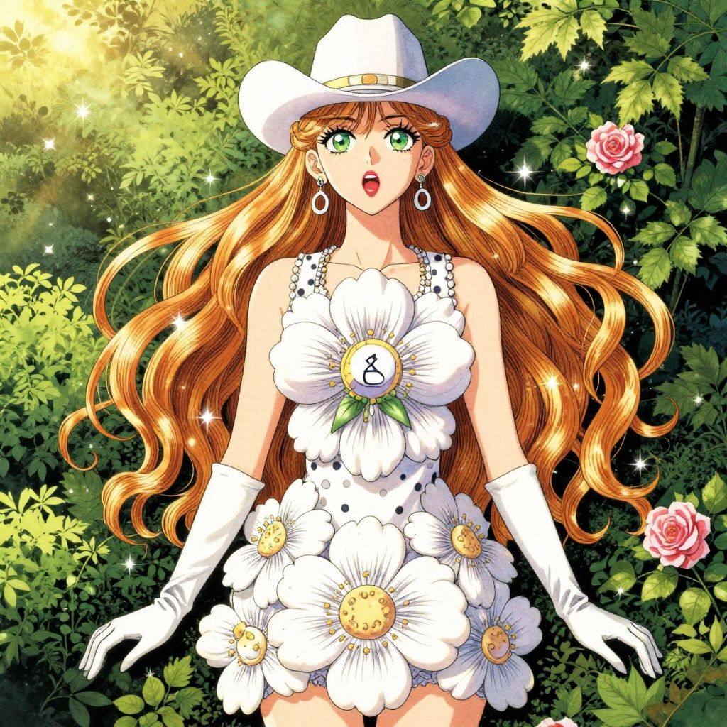 (Masterpiece, Best Quality:1.3), highres, 8k, highly detailed, 2d, (faux traditional media:1.3), manga, illustration, (mature female!.3), fantasy, thick lineart, outline, ((centered)), sugar_rune, flower, cowboy shot, flower dress, solo, green eyes, polka dot, 1girl, sparkle, bush, open mouth, earrings, sleeveless, standing, gloves, overgrowth, wariza, (perfect hands), looking at viewer, fairytale, wonder, dreamy, golden hour, outdoors, leaves, long hair, jewelry, white gloves, nature, doughnut hair bun, half updo, ((depth of field)), 85mm, hyperrealistic, film grain, colorful, lipstick, (very long hair), (rose garden), shadow, (natural lighting:1.1), long face, (jmature female:1.3), stylish, fashion, bloom, (deep depth of field)