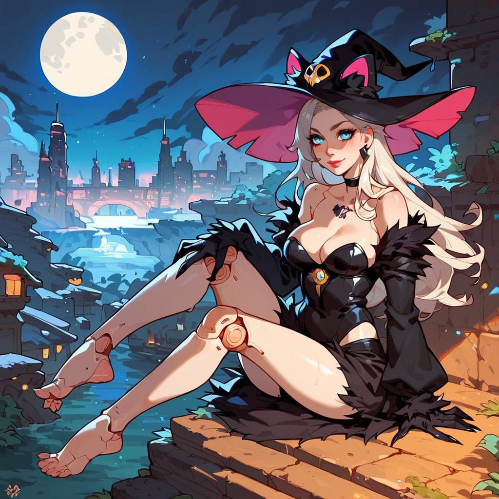 Digital anime-style illustration of a sexy witch with white hair, large breasts, black outfit, and pink hat, sitting on a ledge under a full moon