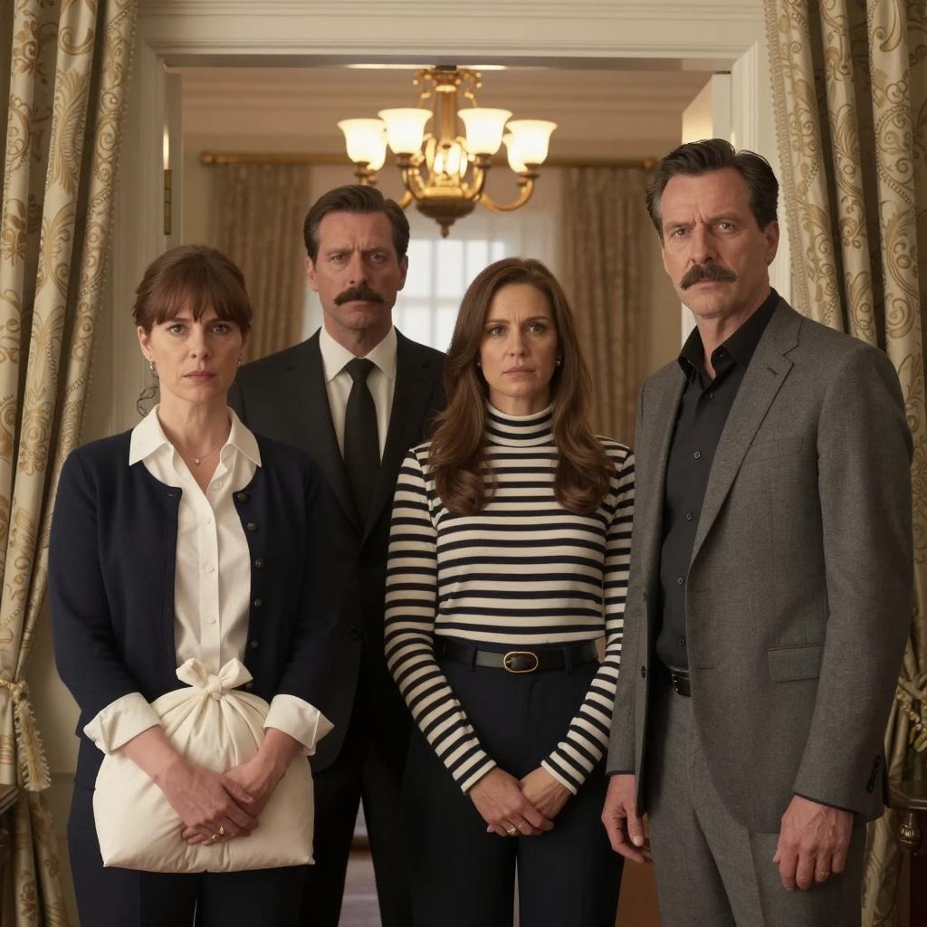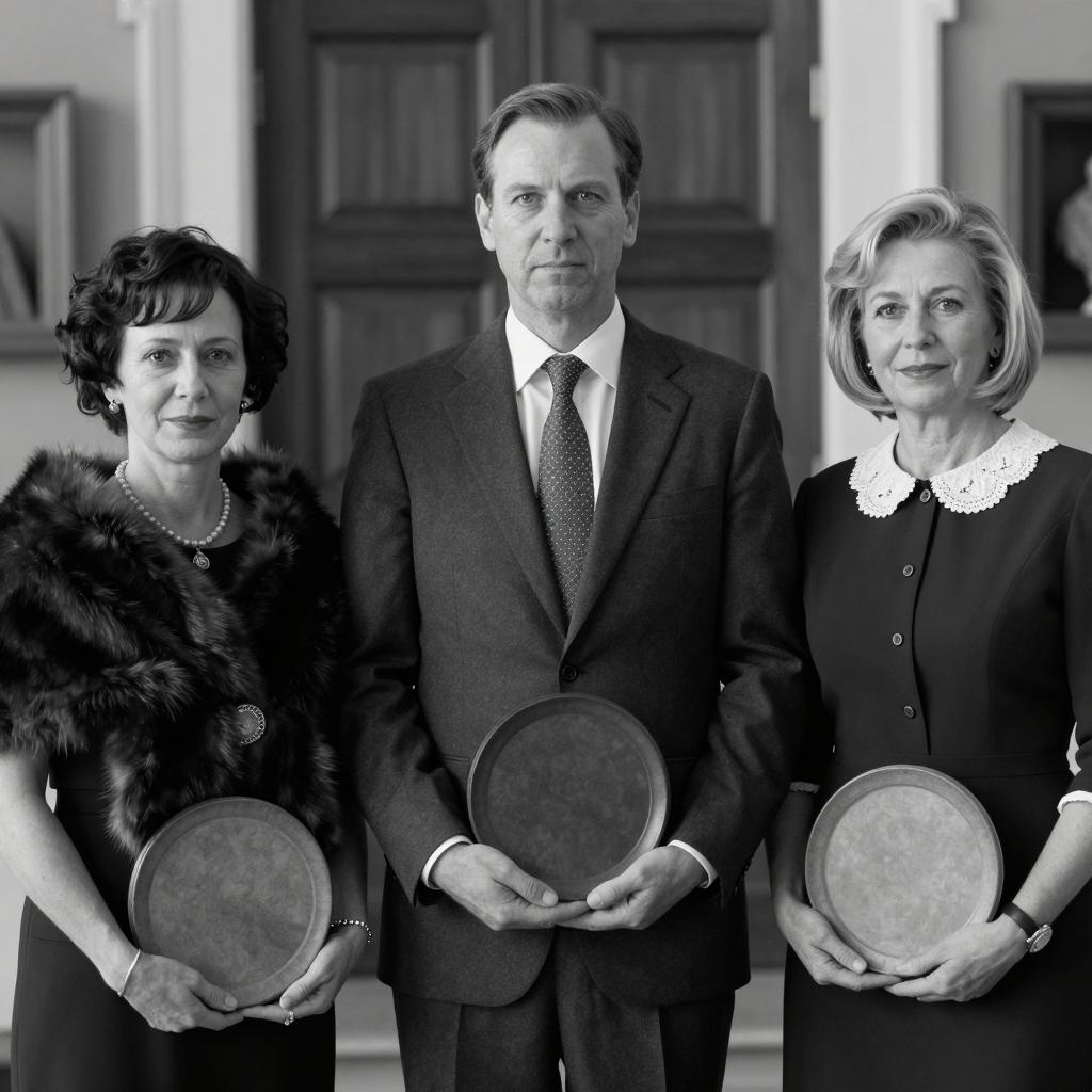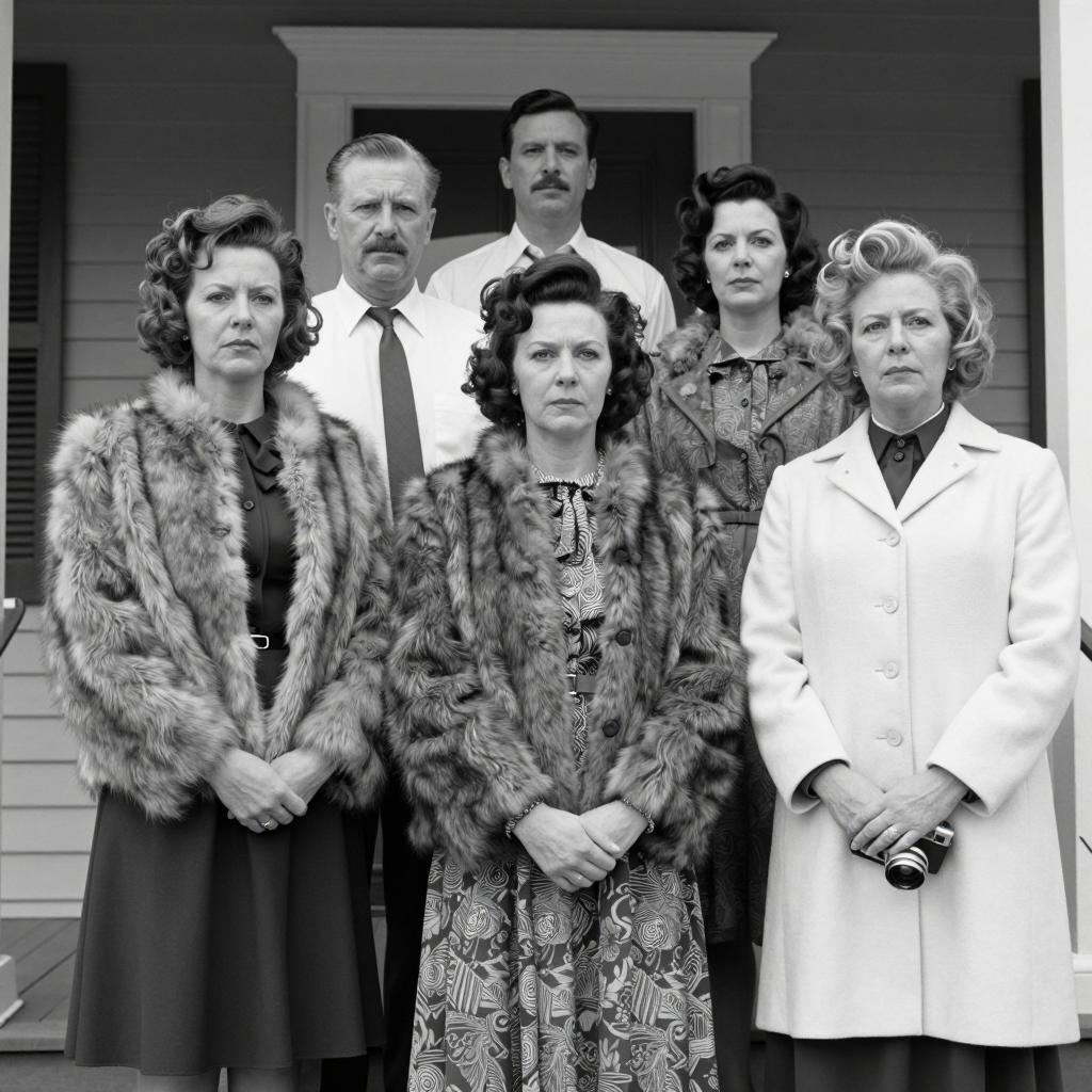 Black and white photograph of six people standing on a porch, featuring five women and one man dressed in 1960s attire. Women wear fur coats, patterned dresses, knee-length skirts, and have short, curly hair, while the man is in a white shirt and tie with a mustache. The woman on the right is wearing a white coat and holding a small camera. They all have serious expressions, standing in front of a house with visible steps, window, and siding.