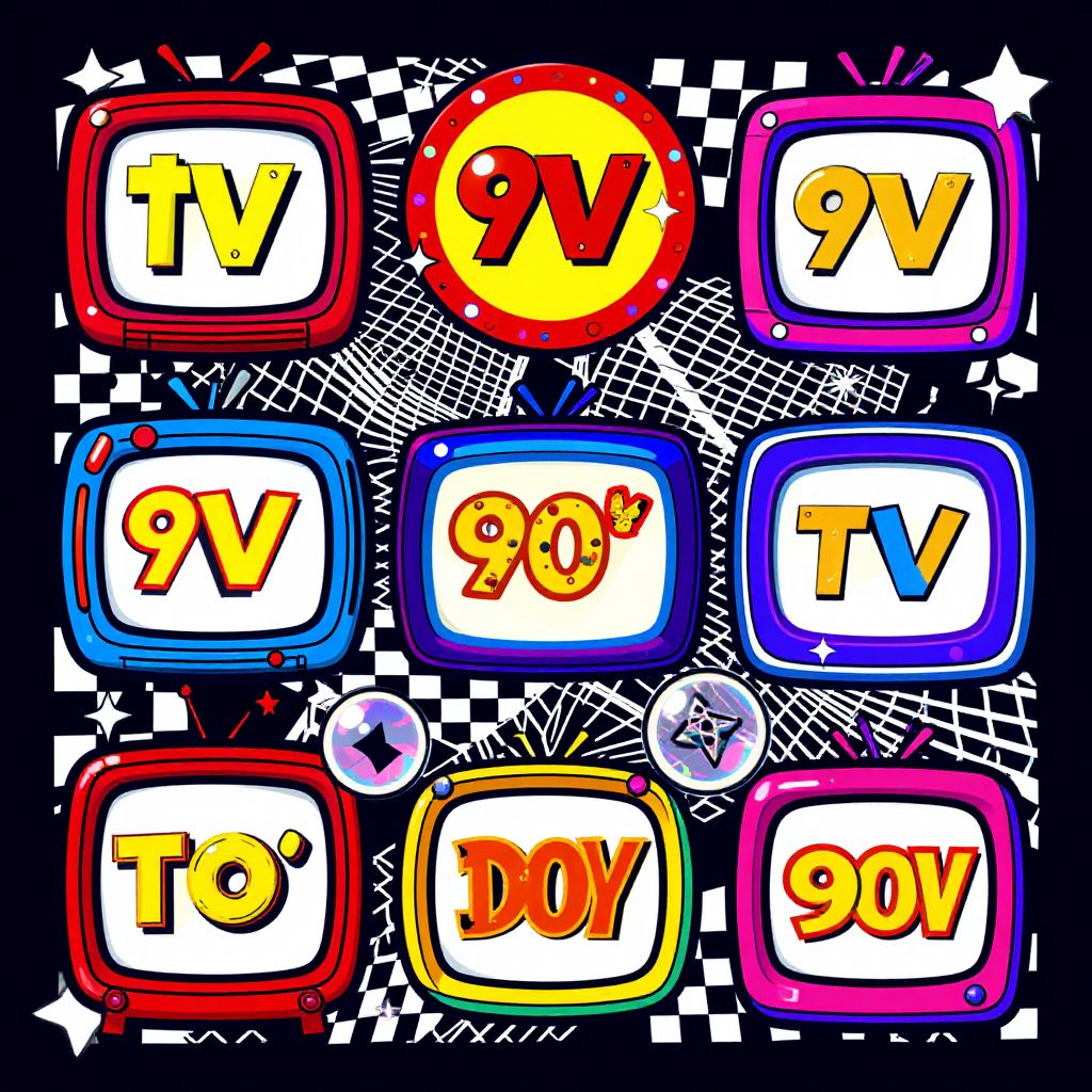 Vibrant digital artwork featuring colorful TV letters (TV, 9V, OV, 90V, TV, TOV, 90V