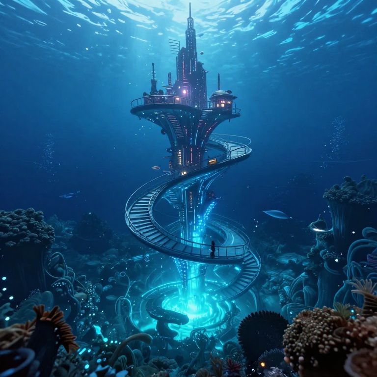A mesmerizing underwater world where a spiraling staircase descends into a bioluminescent abyss, connecting a futuristic city above the waves to a hidden, glowing realm below.