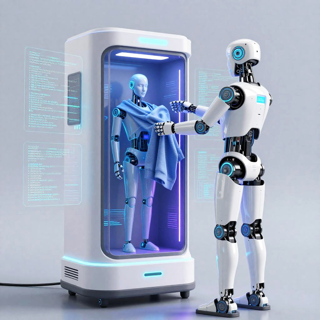Photorealistic CGI image of two humanoid robots in a futuristic lab. The robot on the left stands inside a cylindrical, illuminated white enclosure with blue lights, wearing a blue towel over its head and shoulders. The robot on the right, standing outside the enclosure, has white and black segmented armor, blue glowing accents, and is gesturing toward the enclosed robot. The background is a plain white, with blue, glowing, digital text on the left side. The scene conveys a sense of interaction and maintenance between the robots.