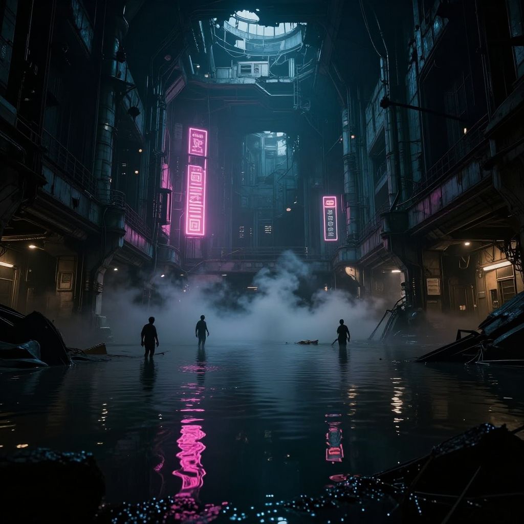 Dystopian underground city partially flooded, crumbling infrastructure, neon signs reflecting on water, scavengers exploring, smoky atmosphere, stark contrast between advanced tech and decay