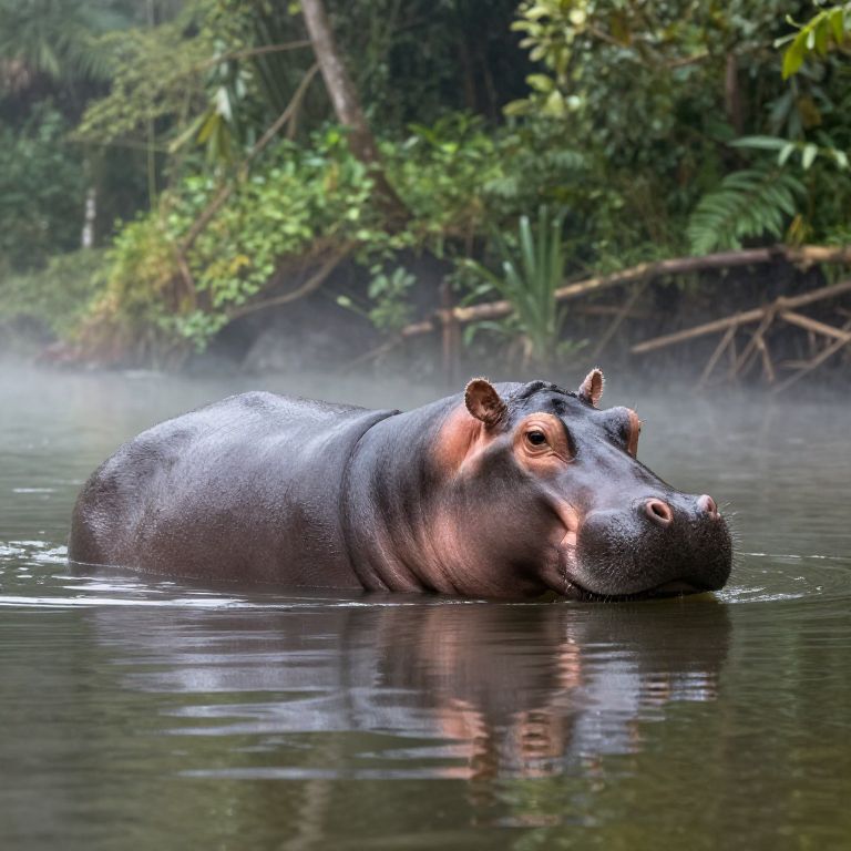 A hipopotamo submerged partially in a calm river surrounded by dense jungle, morning mist rising, hyper-realistic style with intricate water reflections and wet skin details, soft natural light, emphasizing peaceful coexistence with nature.