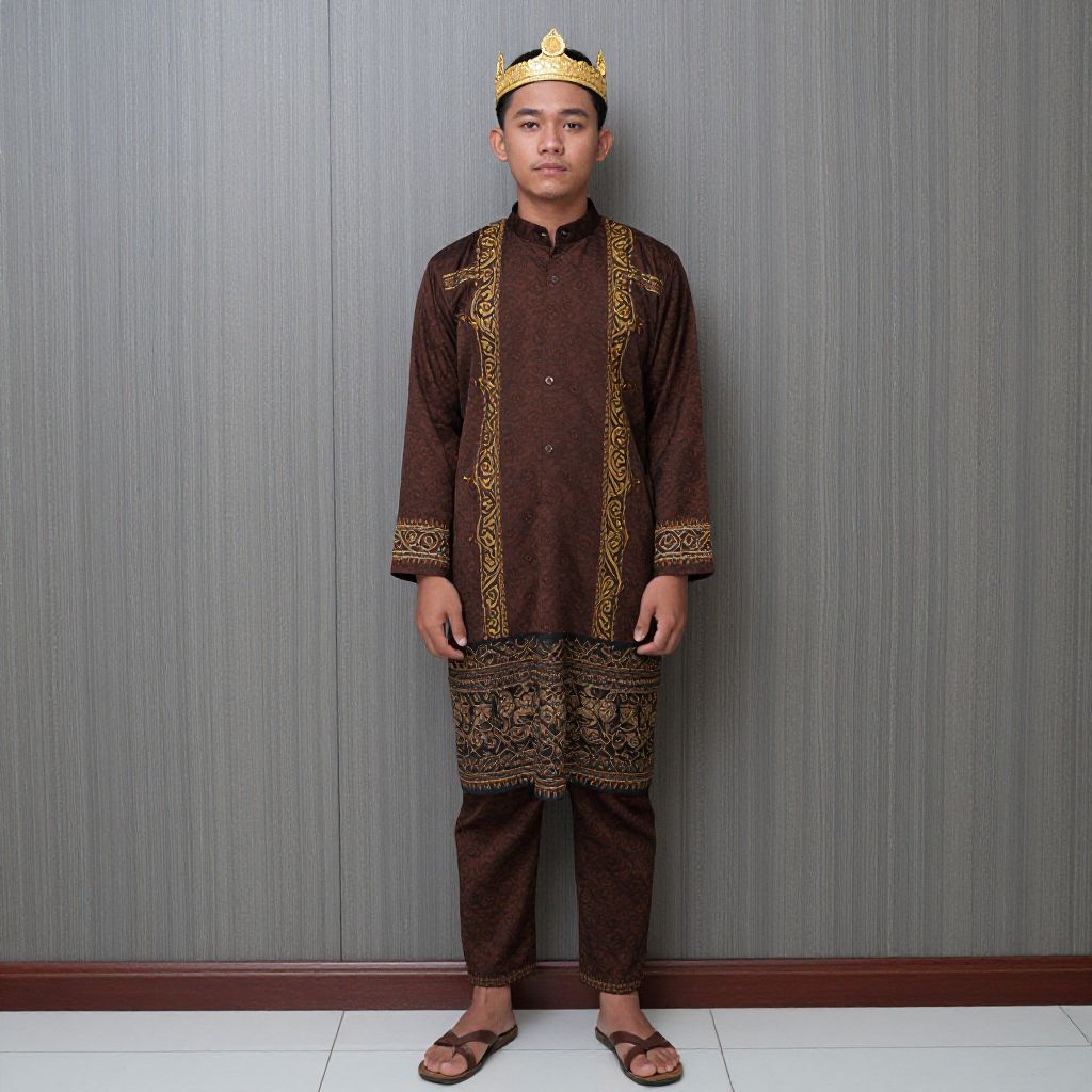 Photograph of a young man standing against a gray textured wall. He wears a dark brown, long-sleeved, traditional outfit with intricate gold embroidery on the sleeves, chest, and lower legs. A gold crown sits on his head. His expression is neutral, and he stands with his arms relaxed at his sides. He has short black hair and is wearing brown sandals. The floor is white tile. The overall style is traditional and formal.