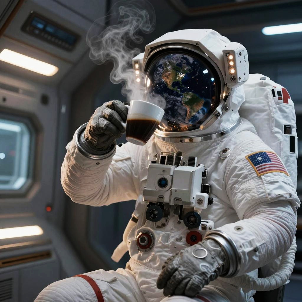 Astronaut drinking coffee on the surface of the moon, stunning earthrise in the background, suit dusted with moon powder, steaming cup held carefully, cinematic lighting with high detail and rich textures, ultra-realistic space scene.