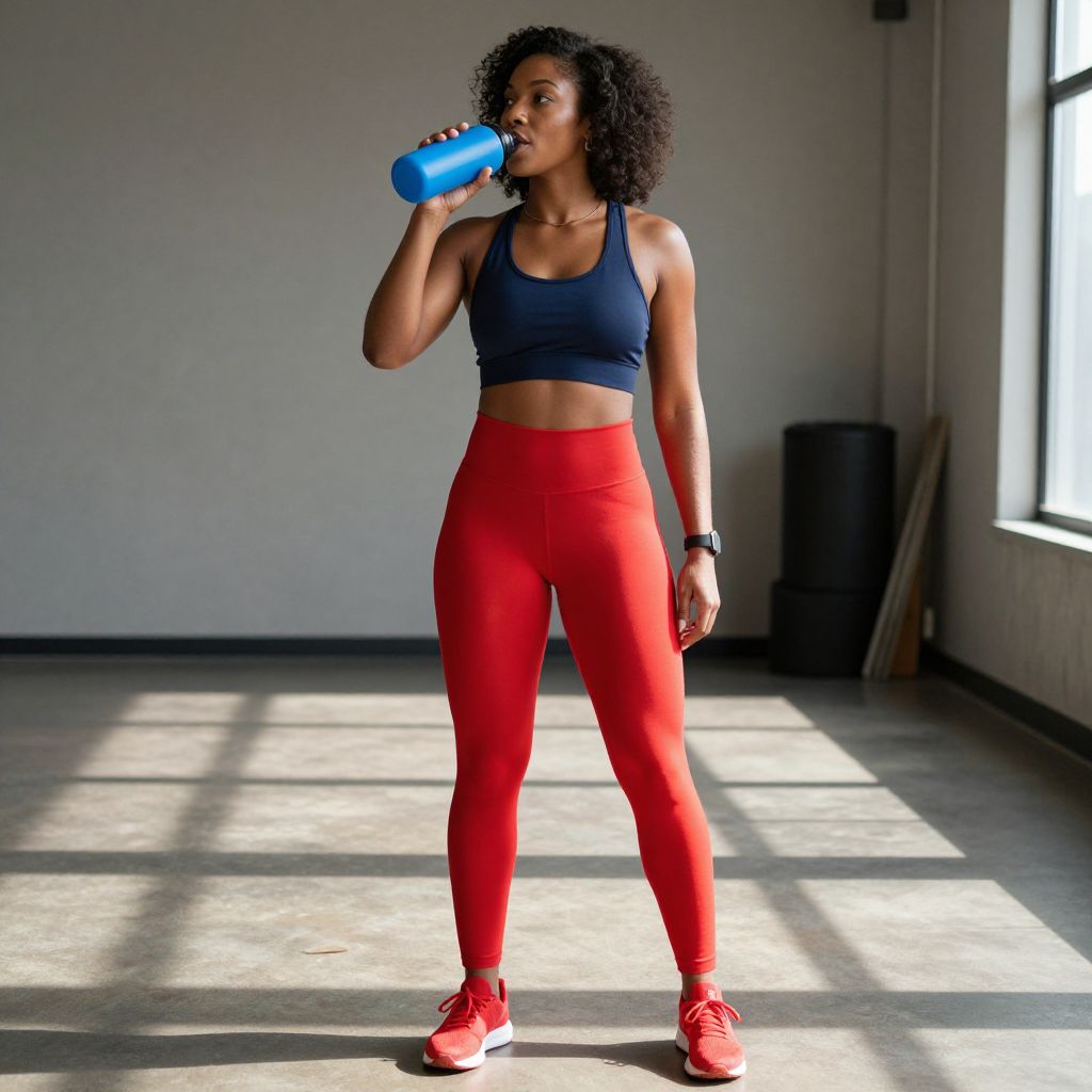 Photograph of a fit Black woman with curly hair, wearing a navy sports bra and red high-waisted leggings, drinking from a blue water bottle