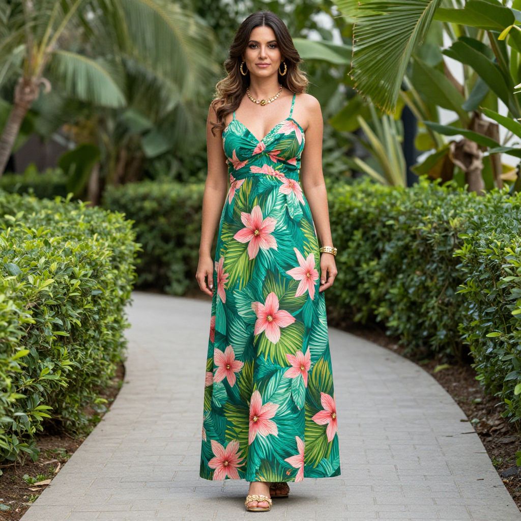 Woman standing gracefully on a paved pathway, wearing a vibrant tropical flower maxidress with bold green and pink patterns, complemented by gold accessories and matching sandals, surrounded by lush greenery and manicured hedges.