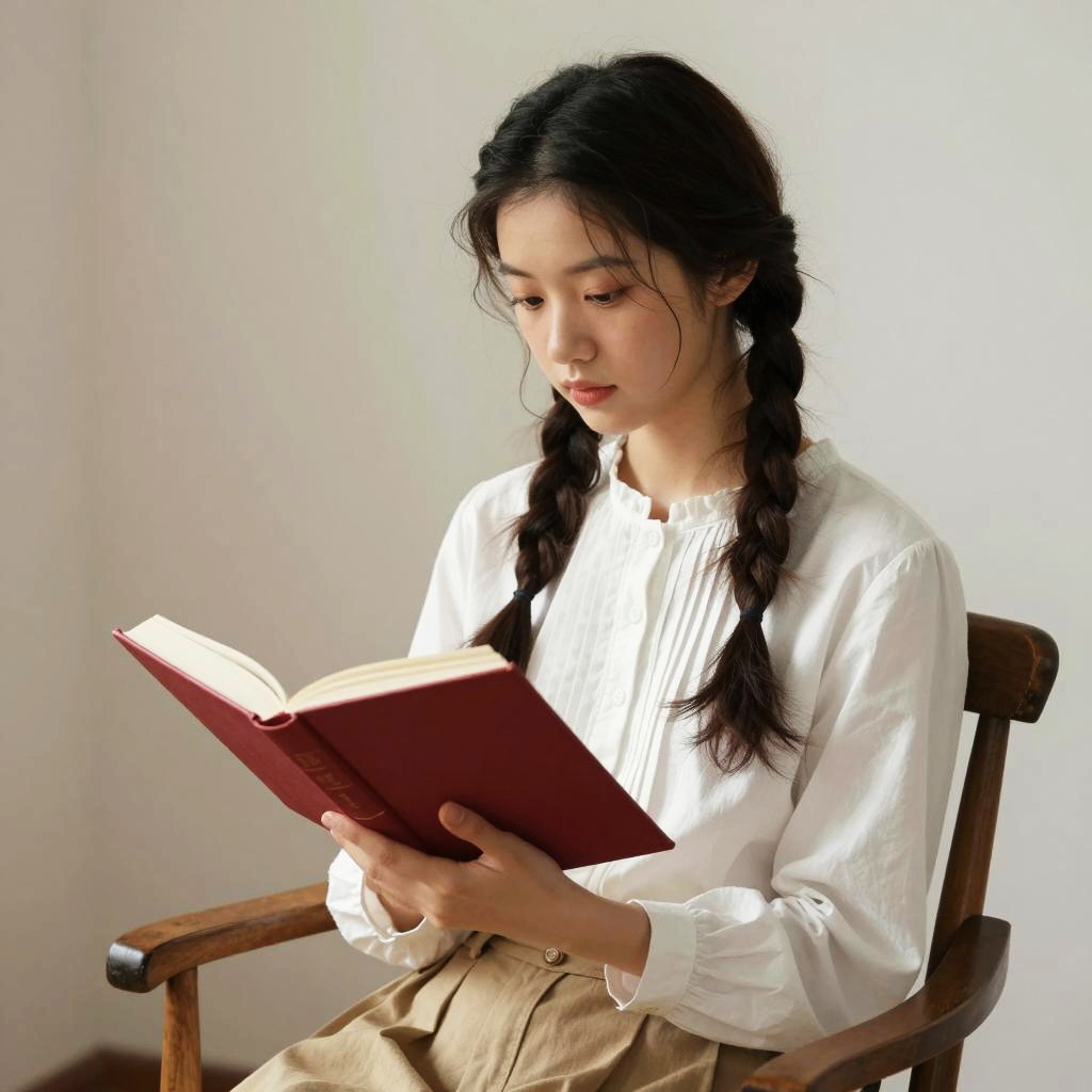 Four young women with long wavy hair wearing light beige draped dresses are crouched closely together on a wooden floor inside an old, dimly lit, and slightly messy room. A man in a dark uniform with a hat stands near a window in the background. The environment has a vintage, rustic feel with items like old photographs, a camera, and documents scattered around. The women appear calm and introspective, with soft natural light illuminating their faces and simple clothing.