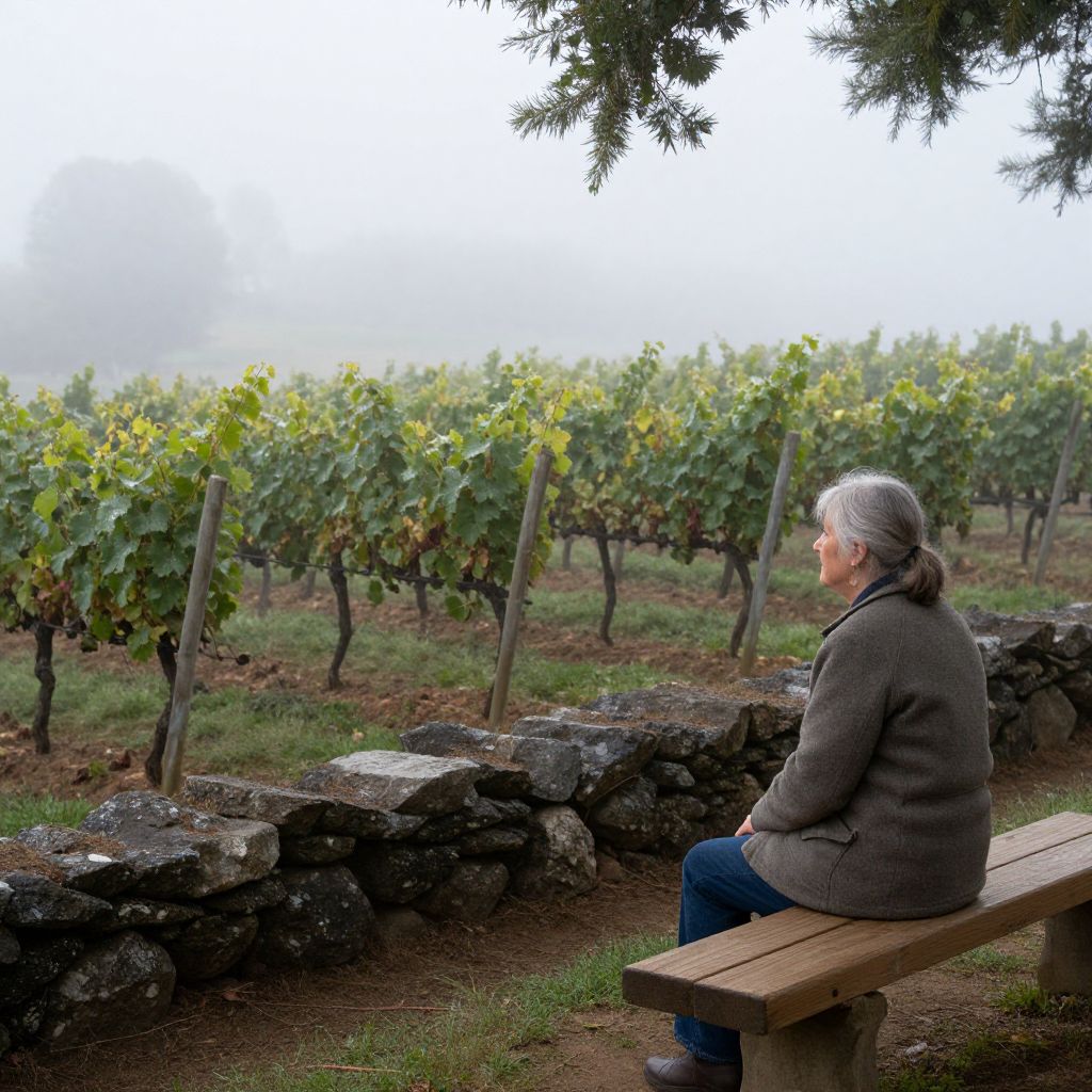 A realistic photograph of a fog-covered California vineyard in Sonoma County during early morning, with thick white fog drifting gently over grapevines and stone walls. A soft, natural light filters through the mist, illuminating the dew-covered leaves. A gentle, elderly woman with gray hair and a practical wool jacket sits on a wooden bench, observing the vineyard with quiet focus.