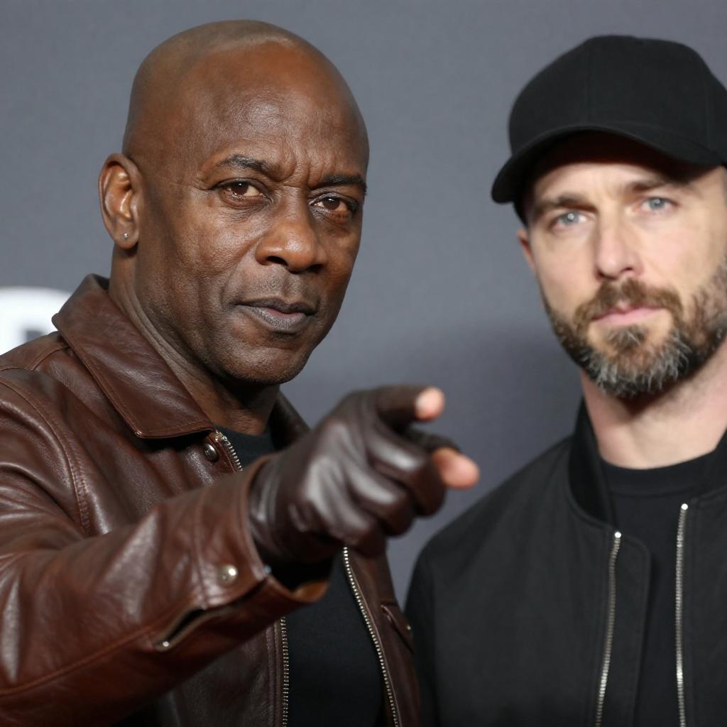 Photograph of two men in a close-up shot. The man on the left is bald with dark skin, wearing a brown leather jacket, and has a serious expression. He points forward with a gloved hand. The man on the right has light skin, a beard, and wears a black cap and jacket, looking slightly to the side. The background is blurred and gray.