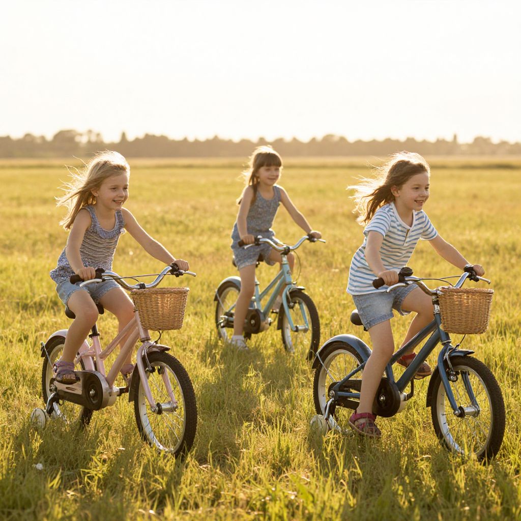 Two children joyfully ride a massive, oversized bicycle across the ocean's surface, defying gravity as they splash through the waves with infectious laughter and goggles crafted from whimsical olive-shaped lenses.