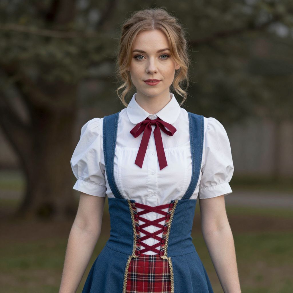 Photograph of a young woman with fair skin and blonde, wavy hair tied back, standing outdoors. She wears a white, short-sleeved, puffed shirt with a red ribbon tie, and a blue, high-waisted pinafore dress with a red plaid underskirt and crisscross lacing at the front. The background is blurred, featuring dark green trees and a grassy area. Her expression is neutral, and she stands with her arms slightly away from her body. The overall style is reminiscent of a traditional school uniform or historical costume.