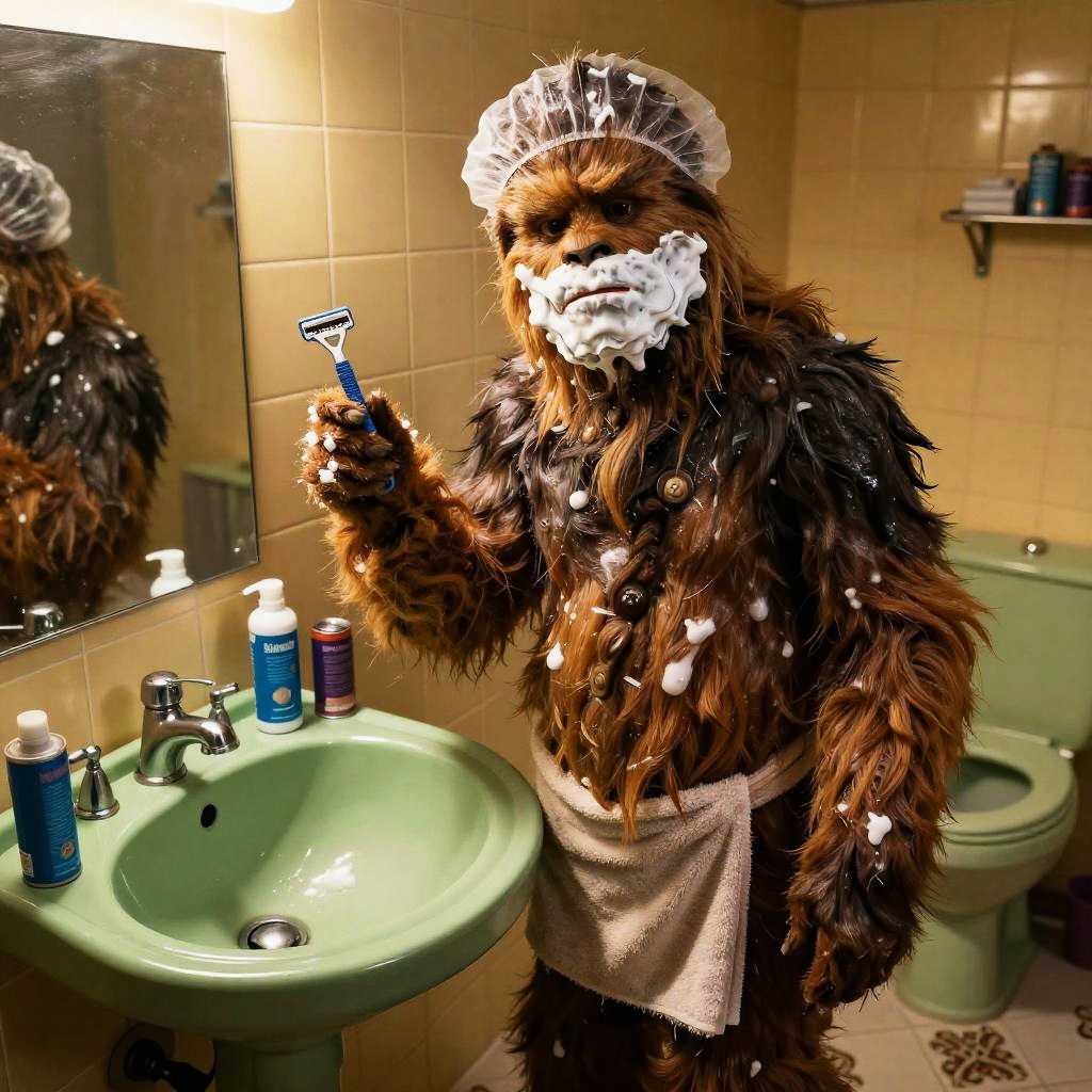 Best quality, high quality, highres, high resolution, high detail, sharp focus, cinematic shadow, a green sink with a vanity mirror, WhiteSlimeAI shaving cream on the sink, empty cans of shaving cream all over the floor. Photograph of a confused tall hairy brown Wookie completely covered in thick foamy WhiteSlimeAI shaving cream, wearing a transparent plastic showercap and a cloth towel around his waist, holding up a disposable razor in one hand. Yellow wall tiles, a green toilet, decorative beige floor tiles.