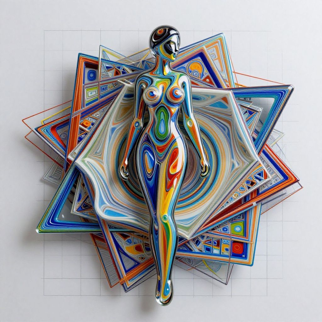 Colorful smooth streaming sharp focused glassy Murano liquid art glass outlining the form of a beautiful slim elegant woman, highly detailed 8k crisp quality colourful hdr acrylic art ultra realistic, technicolored liquid, on a flat plane mathematical, grid, geometric, 3D geometric with angles, abstract, 64 megapixels soft focus abstract vector fractal, Zentangle, 3d shading
