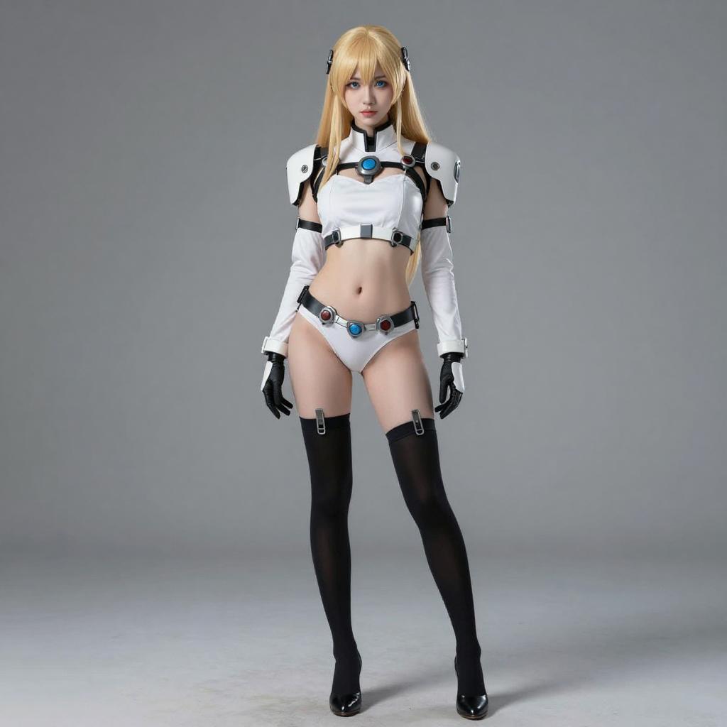 Photo-realistic cosplay photo of person in mu-12 costume. Full body. Standing. Full length. 1girl, blue eyes, long hair, blonde hair, navel, thighhighs, mecha musume, crotch plate, forehead protector, professional photoshoot