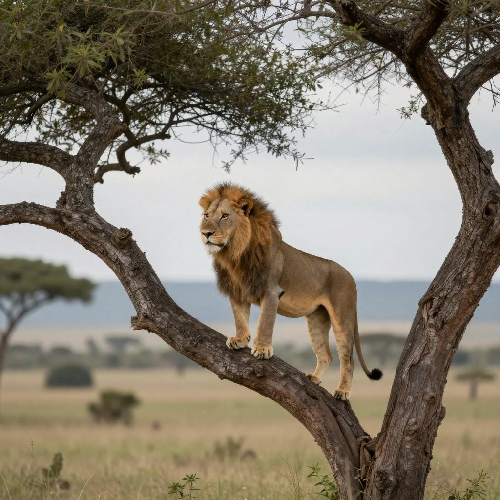 Photograph of a lion pride in a dry, sunlit savanna. Five lions, including two cubs, are under a sparse tree. One lioness is climbing, two cubs are sitting, and two lions are lying down. The background is slightly blurred, highlighting the lions in the foreground. The camera angle is eye-level, with natural light casting soft shadows. Depth of field is shallow.