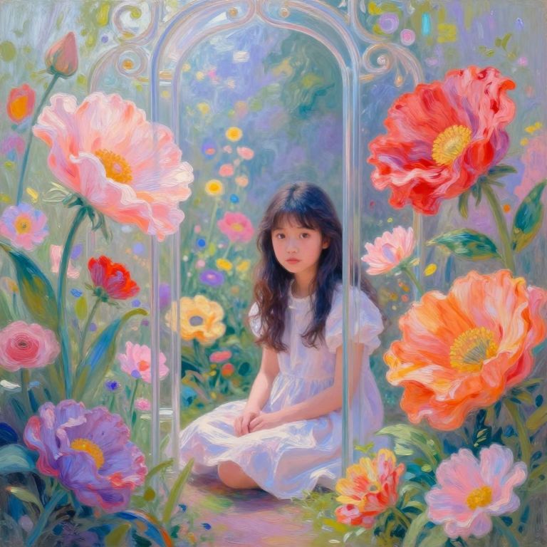 A surreal portrait depicting a young girl sitting amidst an elaborate garden with oversized, vibrant flowers. She gazes directly at the viewer from behind an ornate, clear glass wall. Employing a dreamy brushstroke technique reminiscent of impressionism, the color palette shifts seamlessly between soft pastels and bold, vivid hues, creating a captivating emotional gradient. The scene is captured from an unusual perspective, providing an intimate yet detached view of the girl in her peculiar environment, inviting contemplation on the juxtaposition of the real world with the extraordinary.