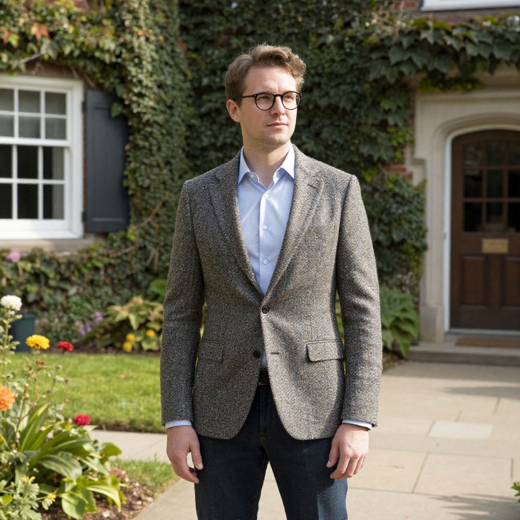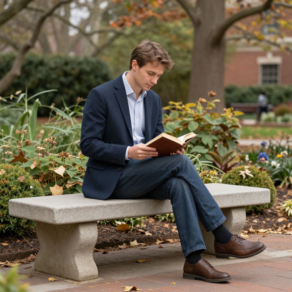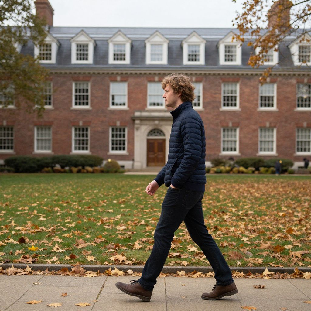 Modern Ivy League, fit European man, in a smart casual outfit, walking across a cobblestone bridge over a serene academic river, realistic photography