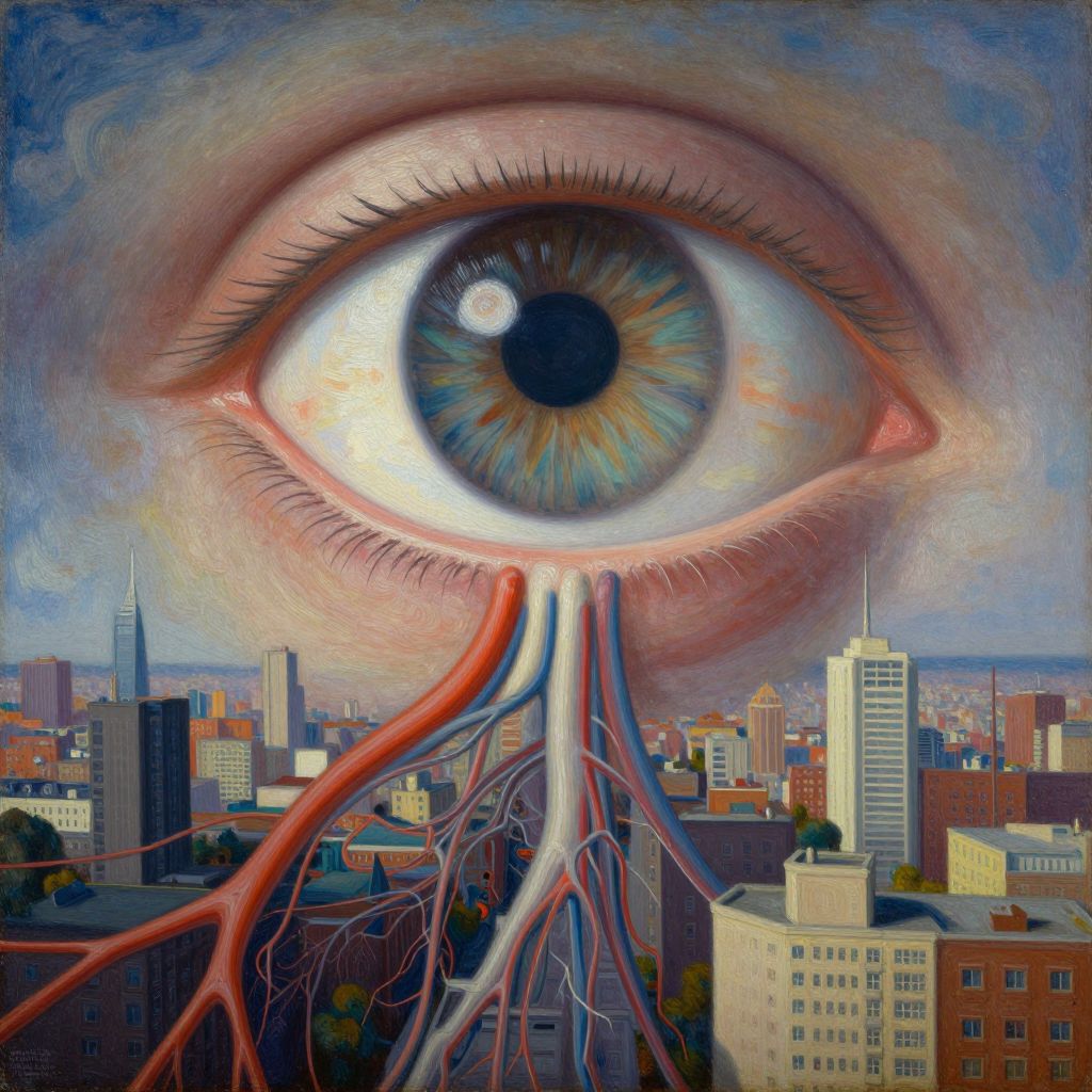 Craft an image depicting a cityscape viewed from the vantage point of a colossal human eye, rendered in the distinctive style of surrealist oil painting. The foreground should showcase the intricate details of optic nerves and blood vessels morphing into the urban landscape, gradually transitioning to the background where reality intertwines with dreamlike abstraction. This visual narrative should evoke a sense of introspection and wonder as it shifts from the chaos of everyday life to serene representations of thoughts and memories, seamlessly blending the two realms in a thought-provoking manner.