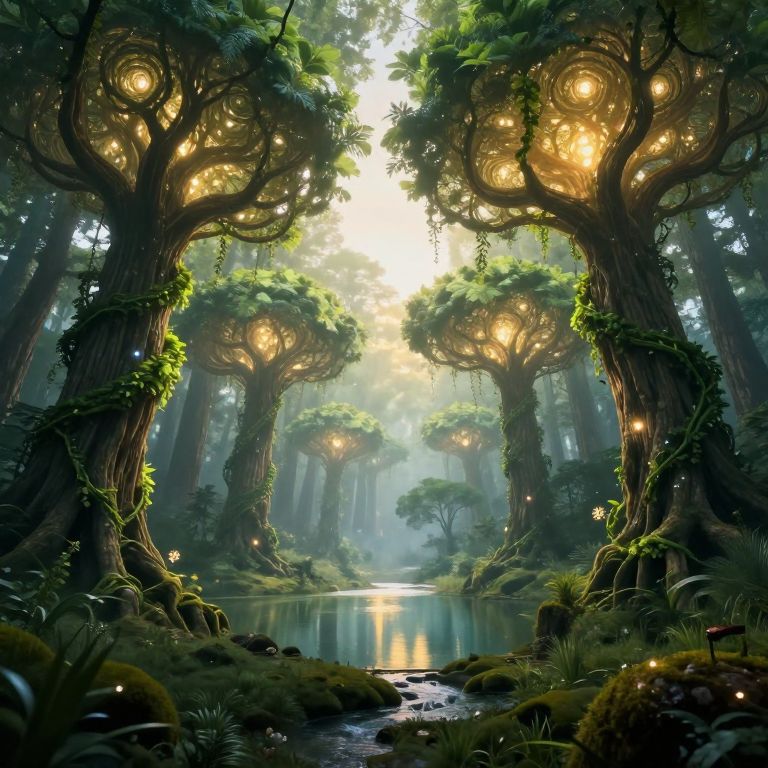 In this ethereal natural fantasy landscape, a secluded epic fantasy forest unfolds, dominated by luminous fractal trees that stretch towards the sky. The trees, adorned with vibrant green vines and shimmering lights, cast a warm glow that dances through the misty air. The forest is bathed in a soft, ethereal light, creating an otherworldly atmosphere. A large lake, reflecting the magical glow, sits at the heart of the forest, surrounded by towering ancient trees and trickling streams. The scene is serene and peaceful, with a subtle glow from the sunlight filtering through the trees, enhancing the natural beauty of the landscape. The overall composition is harmonious, with elements arranged in a balanced manner, creating a sense of depth and dimension. The interplay of colors, textures, and shapes adds to the visual richness of the scene, making it a captivating and enchanting representation of a fantasy world.