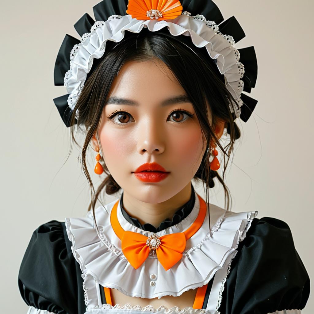 Photograph of an Asian woman with fair skin and black hair wearing a detailed French maid costume. She has bright red lipstick, orange ribbon bows on her headdress and collar, and orange drop earrings. Her eyes are slightly almond-shaped and she has a subtle, neutral expression. The costume features black, white, and orange colors with lace trim. The background is plain and white, drawing focus to her face and costume. The image has a sharp, digital quality with vibrant colors.