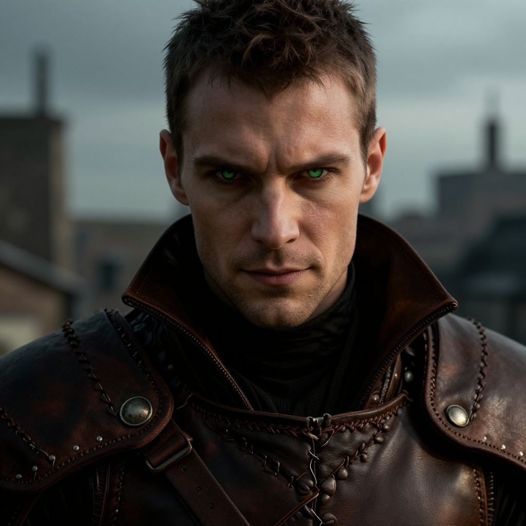 Photograph of a muscular, white man with short, dark brown hair and intense green eyes, wearing a dark brown leather jacket with metal studs and buttons. His expression is stern and focused, with a slight frown. The background is blurred, featuring an overcast sky and indistinct urban buildings, creating a moody atmosphere. The lighting highlights his angular face and strong jawline, casting subtle shadows that emphasize his rugged features. The overall tone of the image is dark and dramatic, with a focus on the subject's determined gaze.