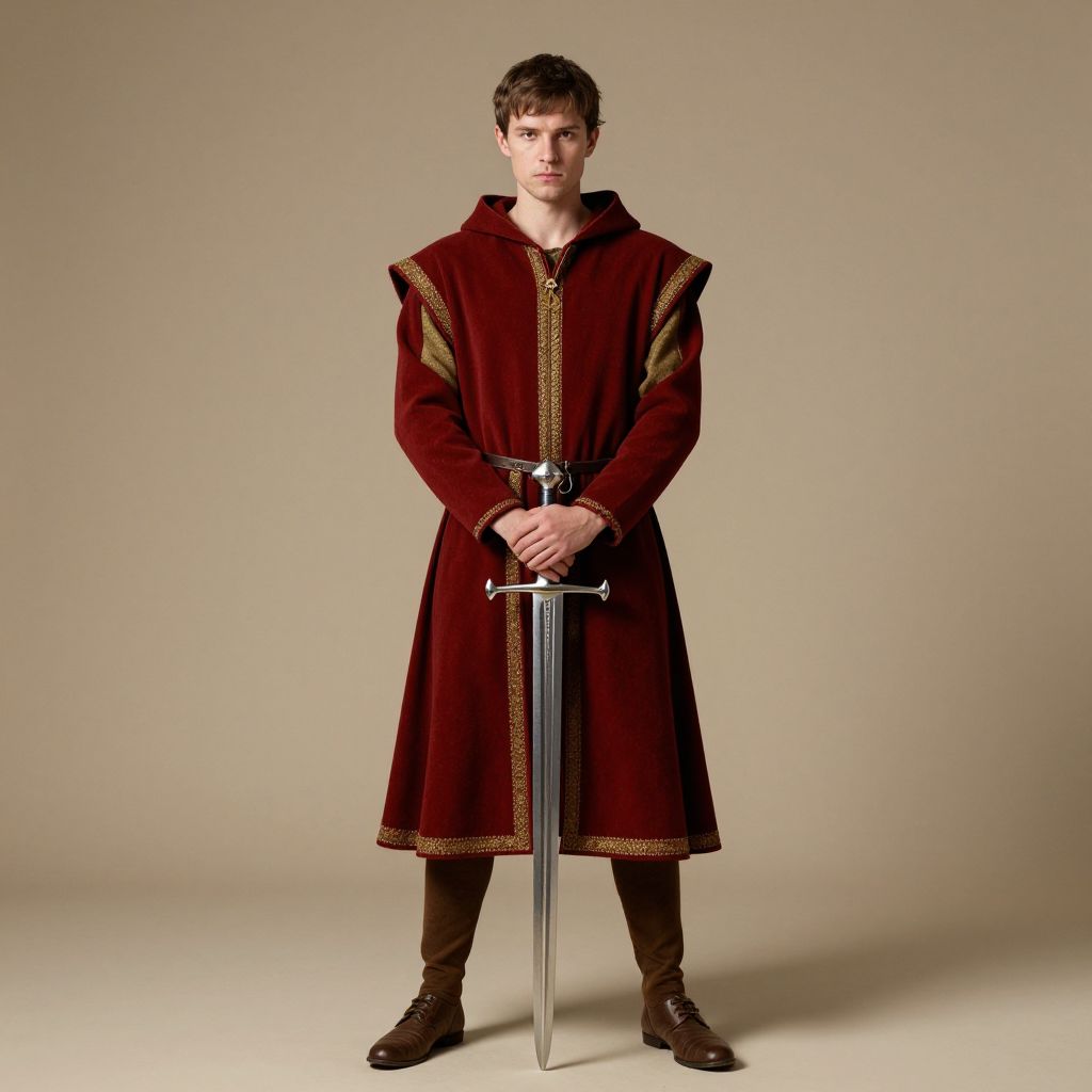 Medieval renaissance monk costume, man in a red and gold outfit holding a sword