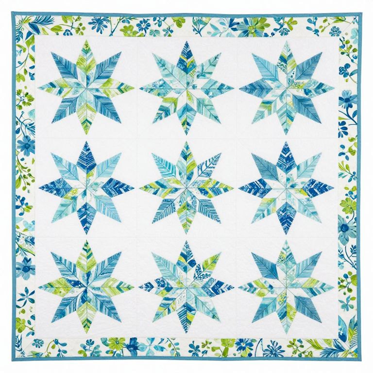 Feathered Star Quilt by Jackie Kunkel showcases a vibrant and symmetrical design featuring nine intricately pieced star blocks arranged in a 3x3 grid, set against a crisp white background and bordered by a delicate floral pattern in shades of blue and green.