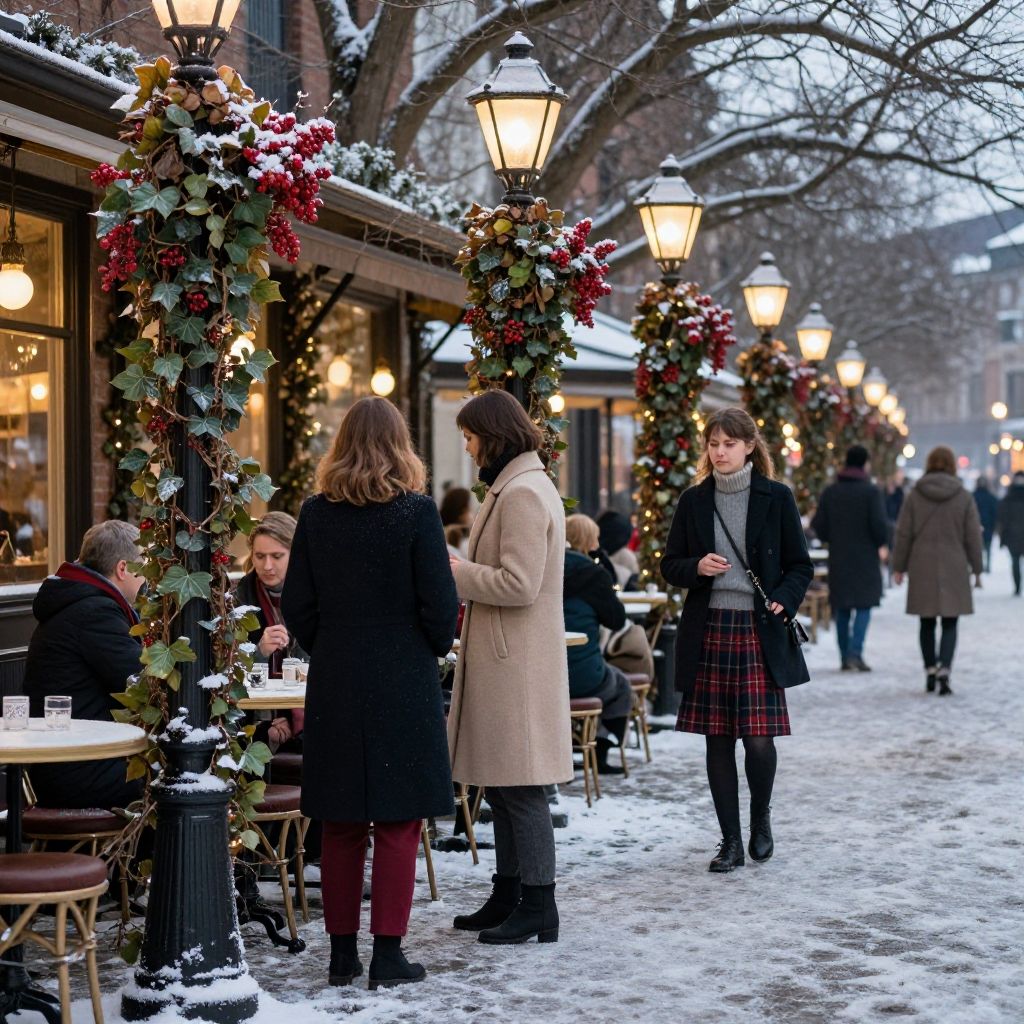 Preppy winter background capturing an elegant outdoor café scene with patrons in smart woolen coats, plaid skirts, and turtlenecks, nestled among snowy streets lined with lampposts wrapped in ivy and winter berries, bathed in soft twilight glow.
