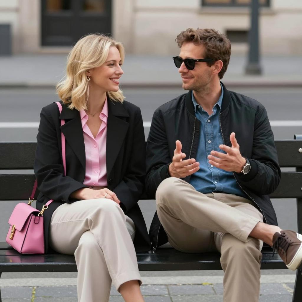 Two people walking outside a brick building with display windows. Man in green jacket, beige pants, short brown hair, pointing. Woman with long blonde hair, white sweater, black pants, hand on hip, black bag. Background: mannequins, clothes, woman with green bag. Potted plants in foreground. Daylight. Casual attire.