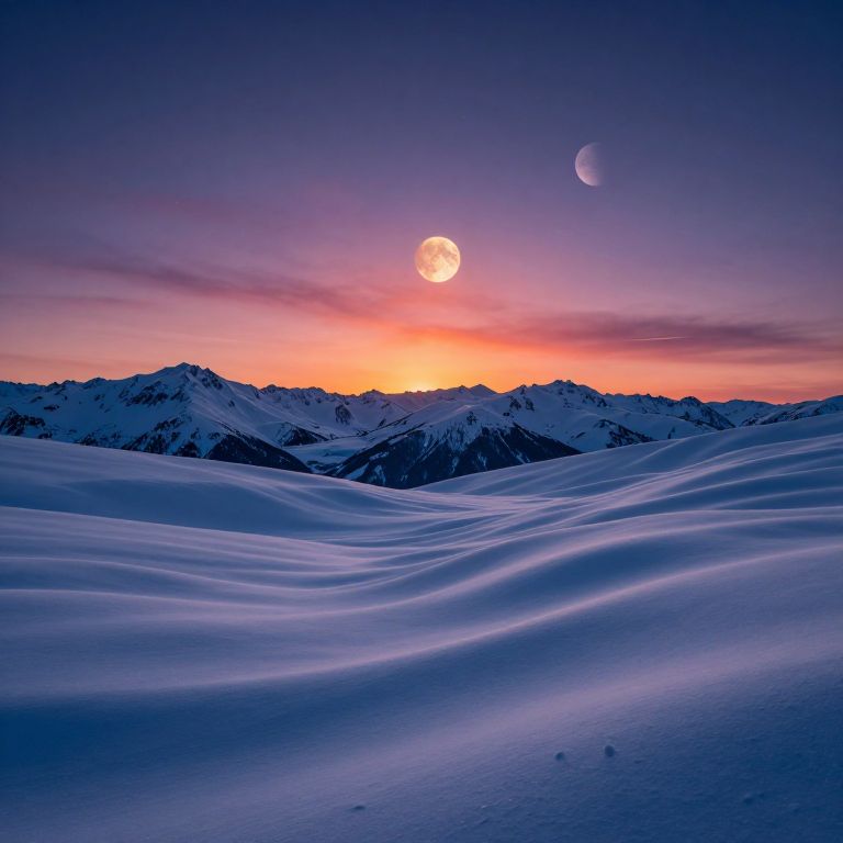 Snow-capped mountains ripple like liquid waves beneath a surreal twilight sky, where a fiery moon and distant planets weave an otherworldly celestial tapestry.