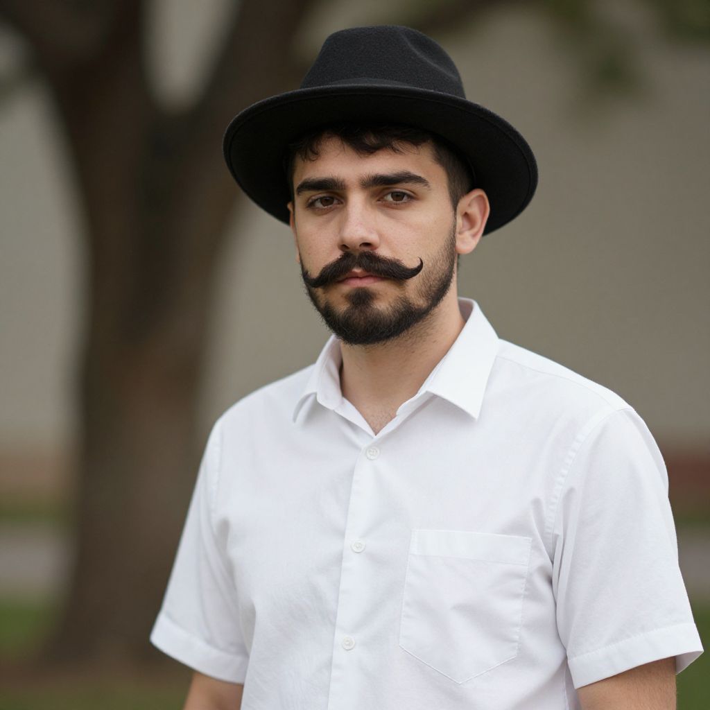 Photograph of a young man with olive skin and dark, wavy hair, wearing a black bowler hat and a white short-sleeved shirt. He has a thick, dark mustache with a distinctive curl at the ends and a well-groomed beard. The background is blurred, featuring a large tree trunk and a gray wall, suggesting an outdoor setting. The man's expression is neutral, and he is centered in the frame. The image has a slight, soft-focus effect, highlighting the subject while blurring the background.
