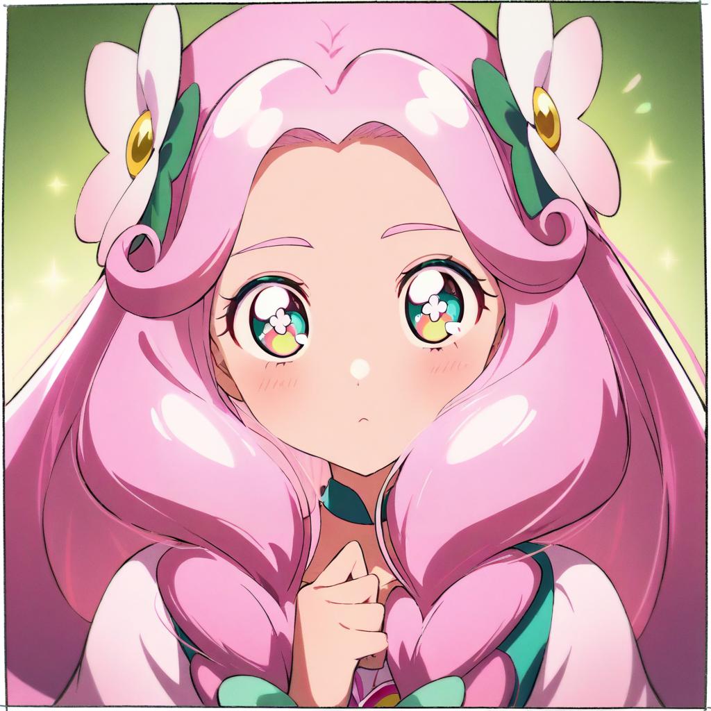 Hanami kotoha, precure, 1girl, green eyes, multicolored eyes, flower in eye, pink hair, long hair, twin braids, hair flower, magical girl, magical girl, by artist kei (soundcross), animagine