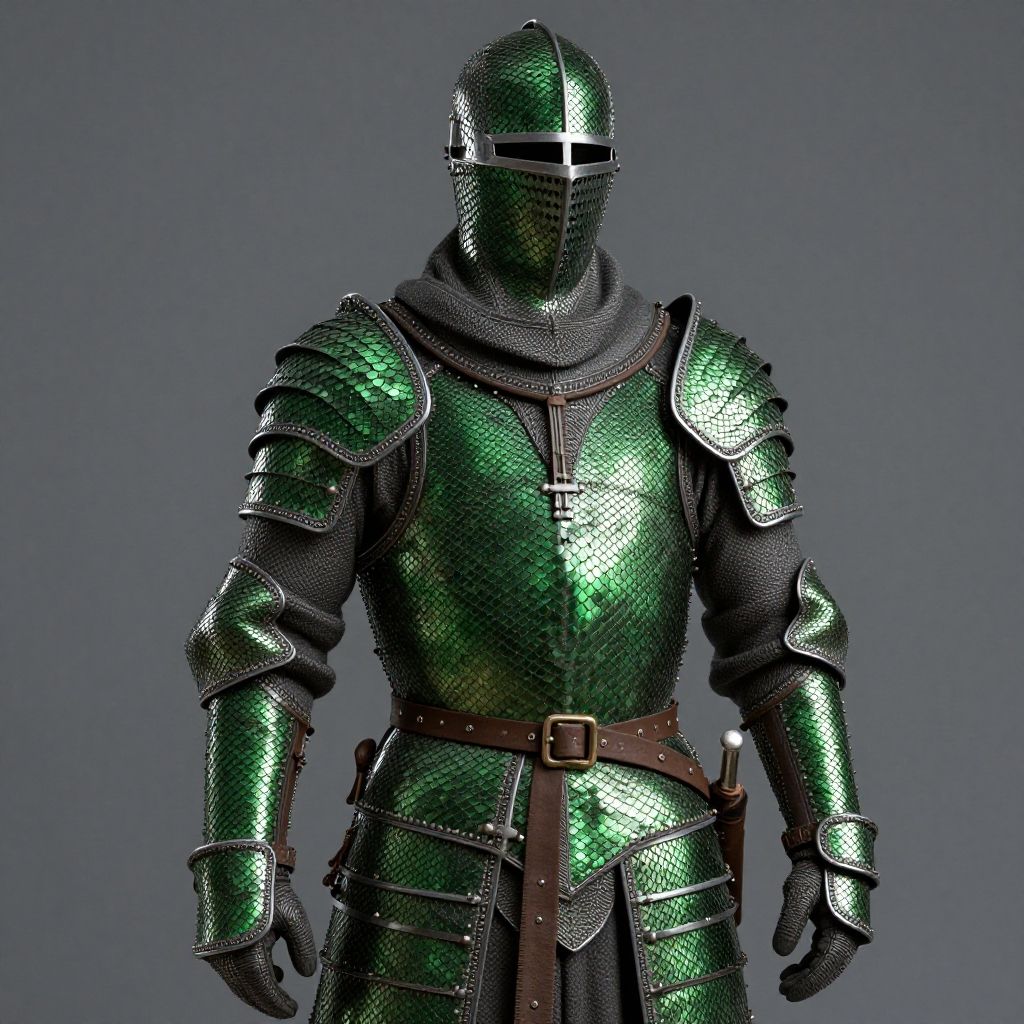 Photorealistic CGI of a green, scale-armored knight in full plate armor with a metal helmet and black face mask, set against a gray background