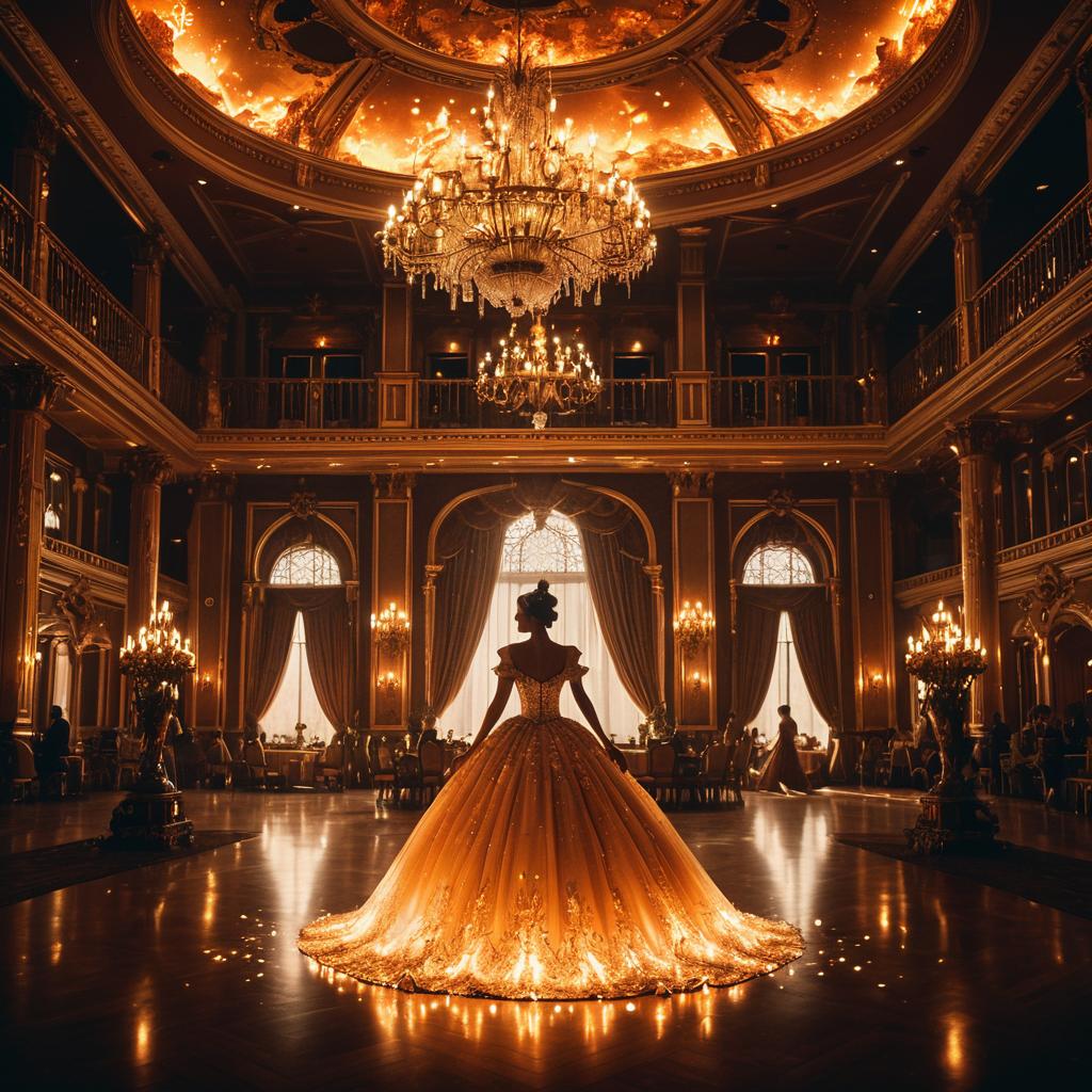 A silhouette of a woman wearing an elaborate glowing ball gown stands in the center of a luxurious, ornately decorated ballroom. The room features grand chandeliers, detailed gold accents, and large arched windows with heavy drapes. Warm, ambient lighting casts a magical glow, highlighting the intricate patterns on the gown and reflecting off the polished floor. The setting evokes a fantasy, ethereal atmosphere with rich, golden tones and a cinematic quality.