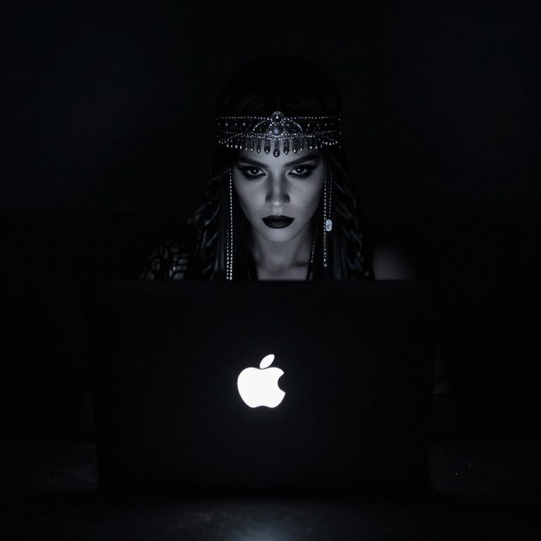 A photograph of a mysterious woman with pale skin and dark, intense eyes, wearing a sparkling headpiece with dangling beads and dark lipstick. Her braided hair is barely visible in the dim light. She is centered in the image, framed by darkness, and gazes directly at the camera. In front of her, a glowing white Apple logo is visible on a laptop, which is the only bright light source. The overall style is dark and dramatic, with high contrast and a moody, almost gothic atmosphere.