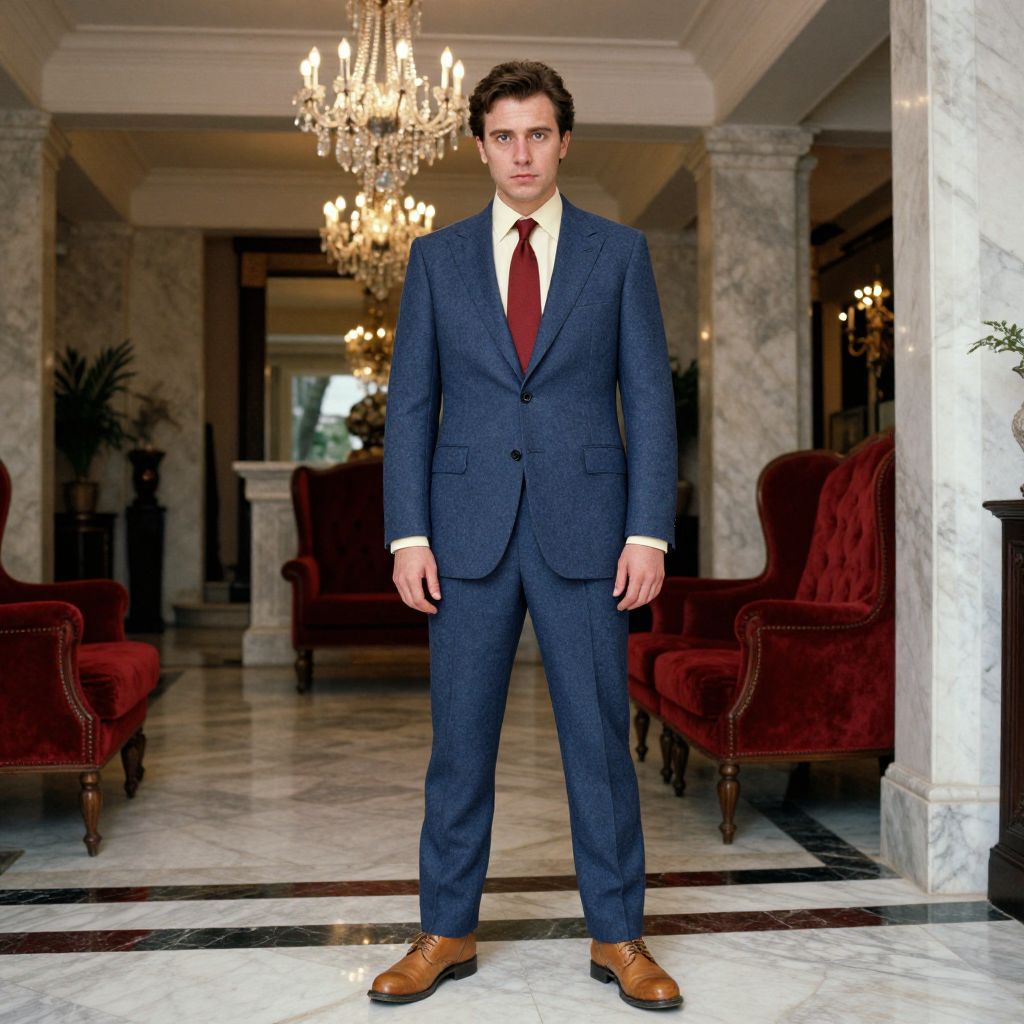 A man, medium blue wool suit, ivory dress shirt, classic red tie, tan leather dress boots, grand marble foyer, crystal chandeliers, plush red velvet seats, technicolor analog film stock, confident expression Man has masculine face and piercing eyes
